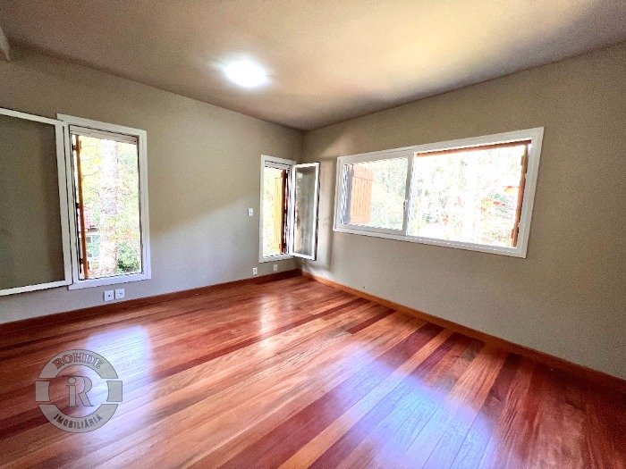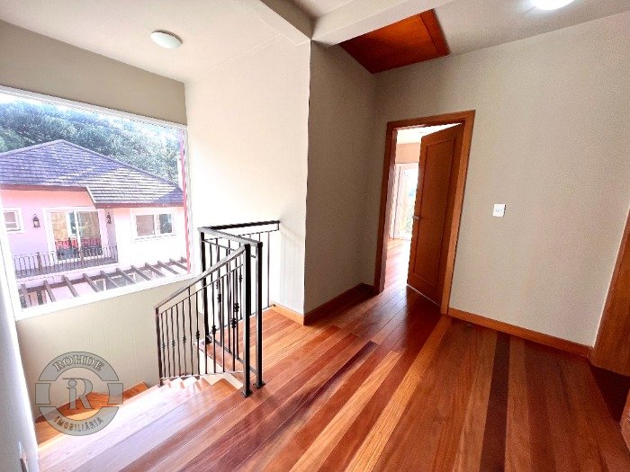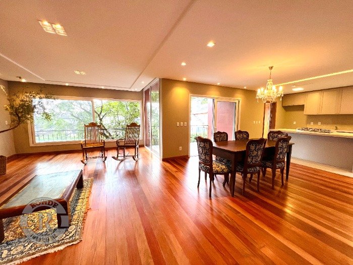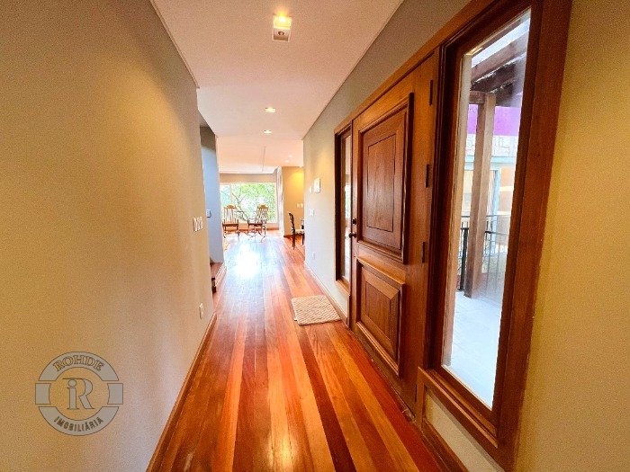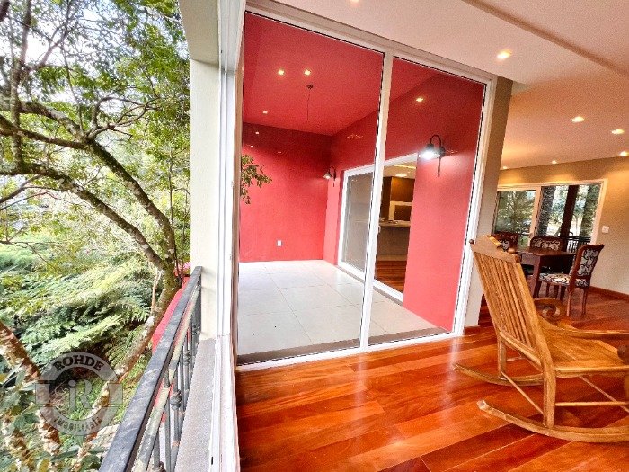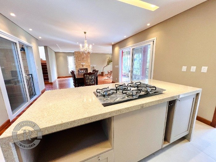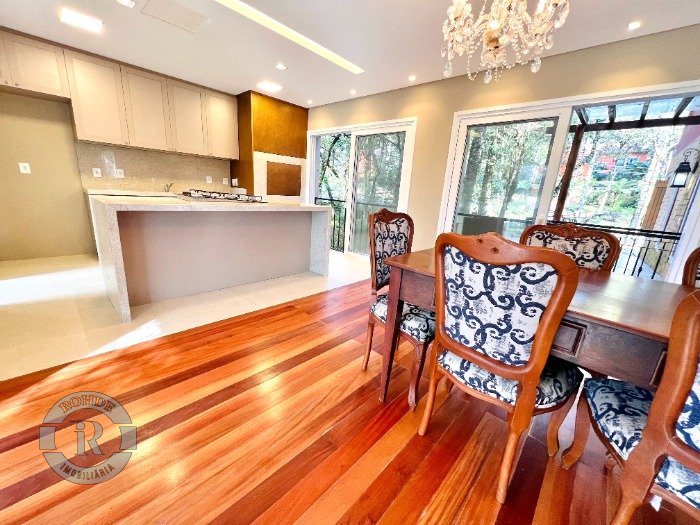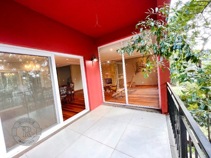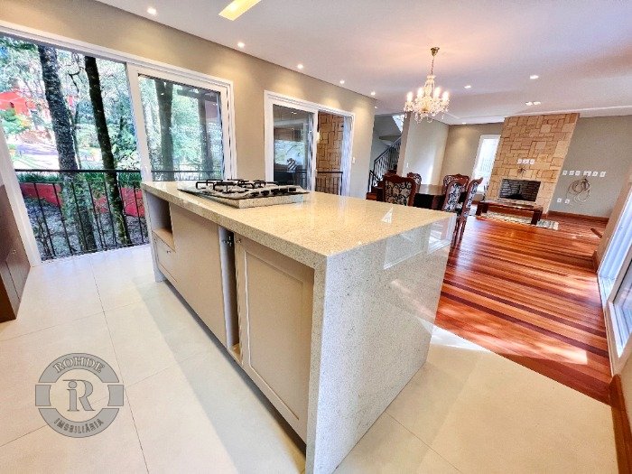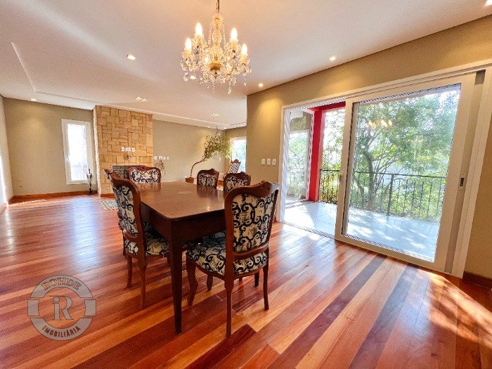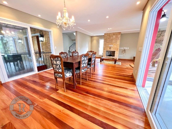Casa com estilo Toscano com 4 suítes. Hall de entrada. Ambientes amplos e iluminados totalmente integrados, tendo sala de estar com lareira, sala de jantar e cozinha americana com churrasqueira. Área de serviço. Dependência completa. Sala de jogos. Garagem para 2 carros com churrasqueira externa. Calefação a óleo. Esquadrias em PVC. Piso em madeira de lei. Casa de maquinas e gás central. Condomínio com muito lazer e natureza tendo 235.000 m2 de área verde. Club House com 2 belos salões de festas, espaços lúdicos, piscina aquecida. Espaço de convivência e gourmet, espaço fitness, quadra de tênis fechada, quadras poliesportivas, quadra de futebol, praça central com paisagismo, áreas com playground e trilhas. Segurança 24 horas.