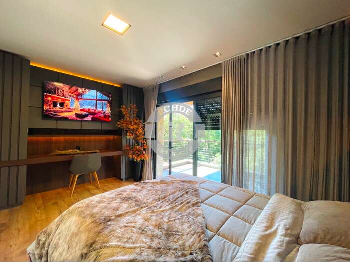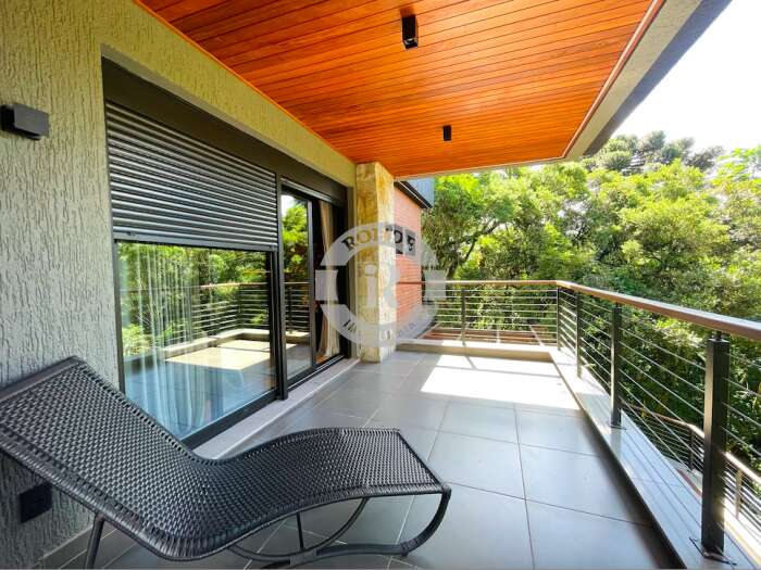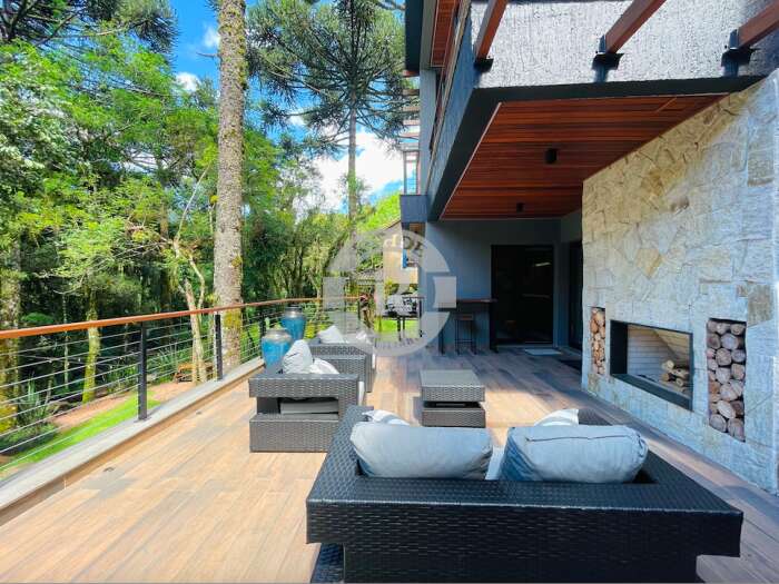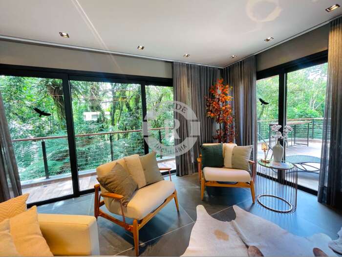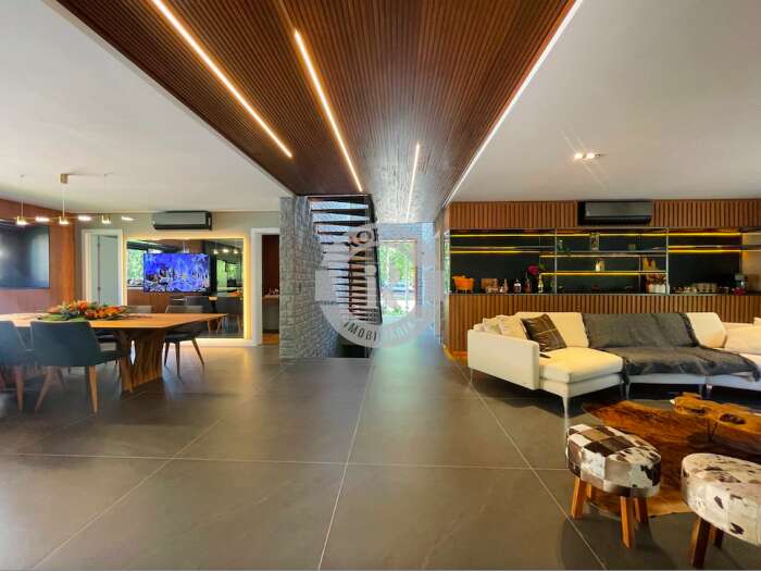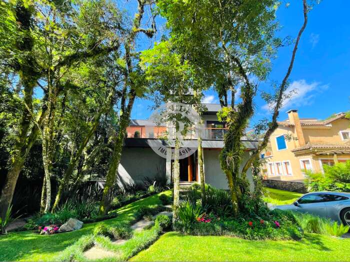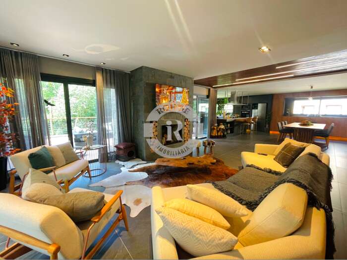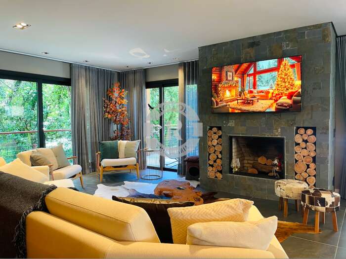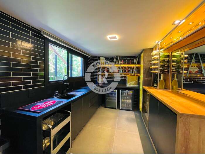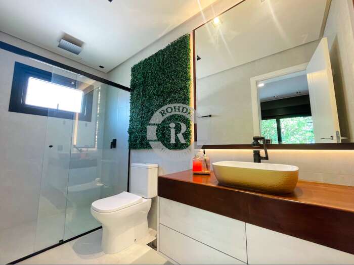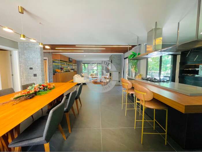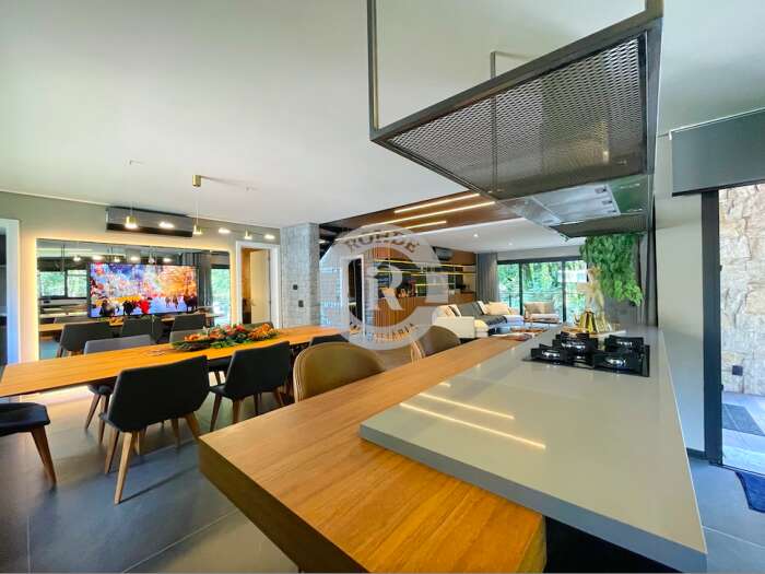 Moderna, acolhedora, mobiliada e com muito estilo. Hall imponente com de pé direito duplo, sala de estar com lareira e bar, ampla sacada com lareira, sala de jantar integrada a cozinha com churrasqueira. Com 4 suítes, sendo 1 suíte térrea e outra suíte máster com closet e charmosa banheira. Sacadas com vista para área de preservação. Adega, sala de cinema com isolamento acústico e paredes revestidas com mosaico de veludo, espuma de alta densidade e madeira grápia. Espaço externo com cozinha adicional com bar, integrado ao estar e jacuzi, adega climatizada e cervejeira. Garagem para 4 carros. Condomínio com infraestrutura completa: Portaria e segurança 24h, salão de festas, espaço gourmet, sala fitness, piscina aquecida, quadras esportivas coberta e descoberta, playgroud, trilhas e praças. Áreas de preservação permanente.