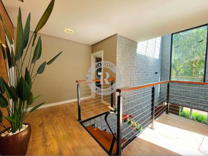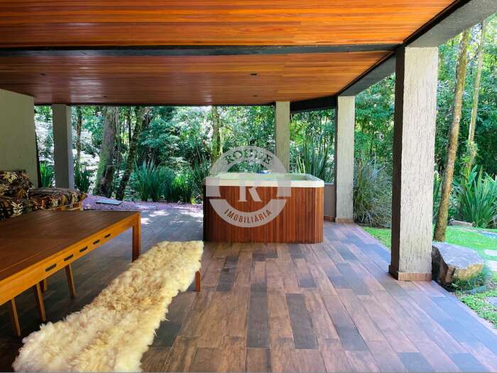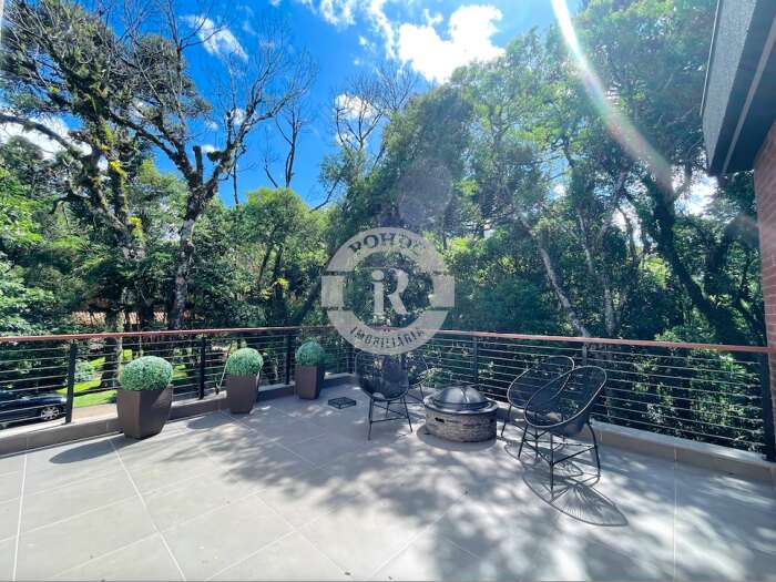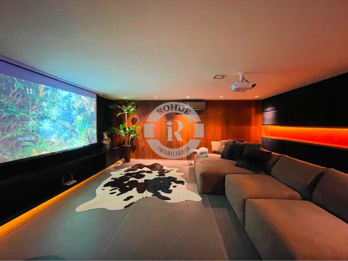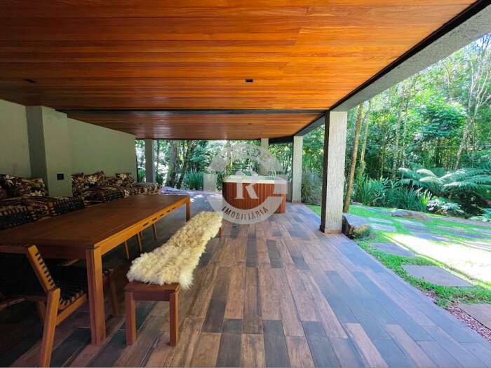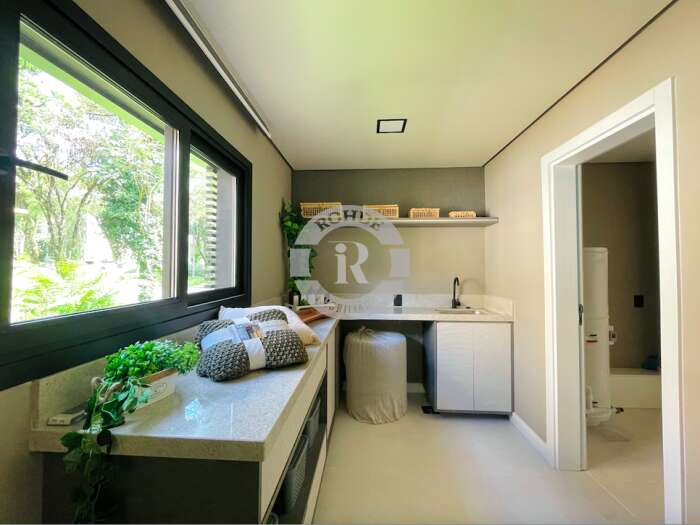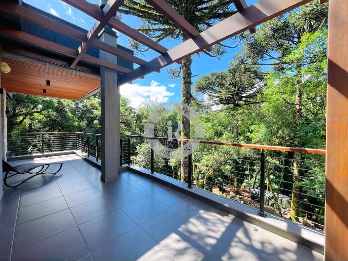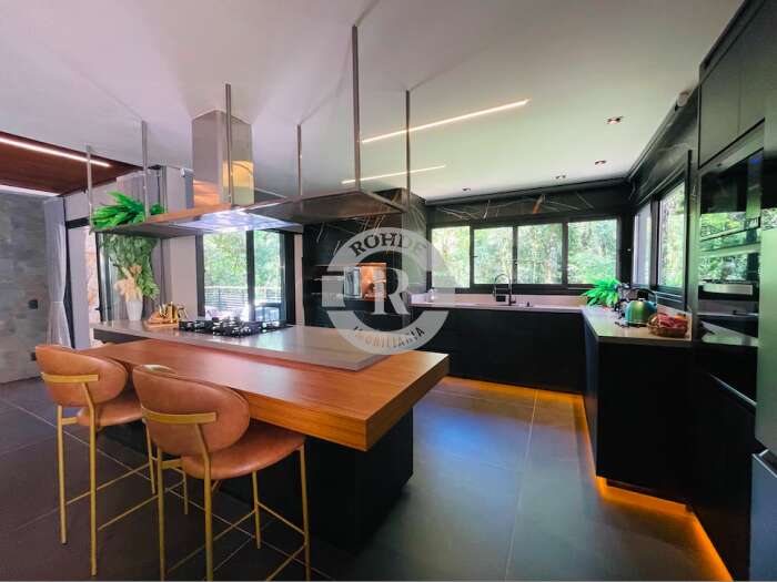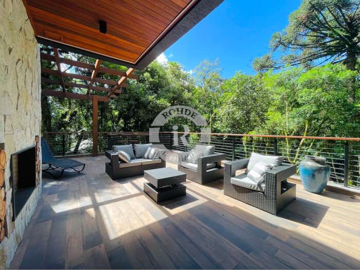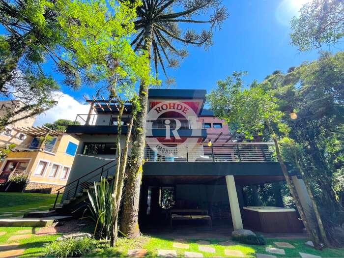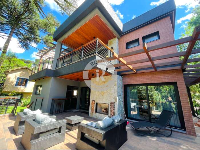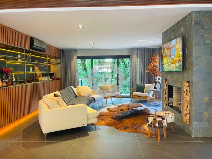 Moderna, acolhedora, mobiliada e com muito estilo. Hall imponente com de pé direito duplo, sala de estar com lareira e bar, ampla sacada com lareira, sala de jantar integrada a cozinha com churrasqueira. Com 4 suítes, sendo 1 suíte térrea e outra suíte máster com closet e charmosa banheira. Sacadas com vista para área de preservação. Adega, sala de cinema com isolamento acústico e paredes revestidas com mosaico de veludo, espuma de alta densidade e madeira grápia. Espaço externo com cozinha adicional com bar, integrado ao estar e jacuzi, adega climatizada e cervejeira. Garagem para 4 carros. Condomínio com infraestrutura completa: Portaria e segurança 24h, salão de festas, espaço gourmet, sala fitness, piscina aquecida, quadras esportivas coberta e descoberta, playgroud, trilhas e praças. Áreas de preservação permanente.