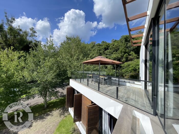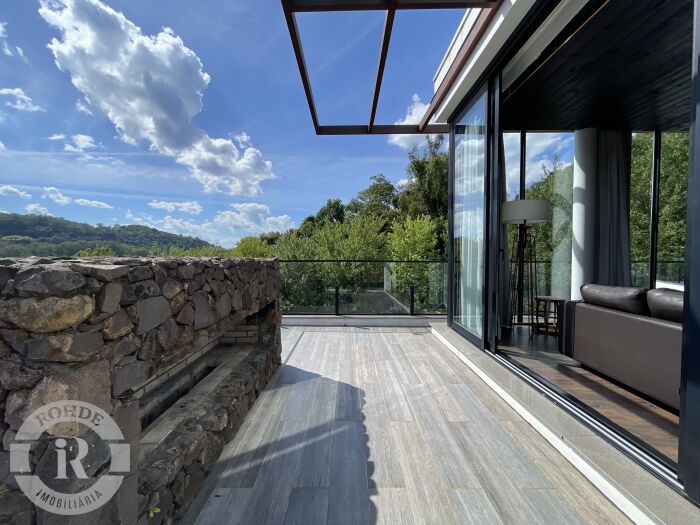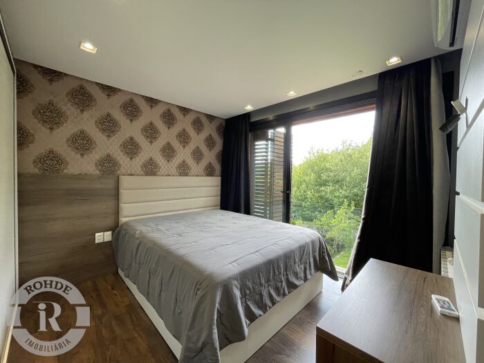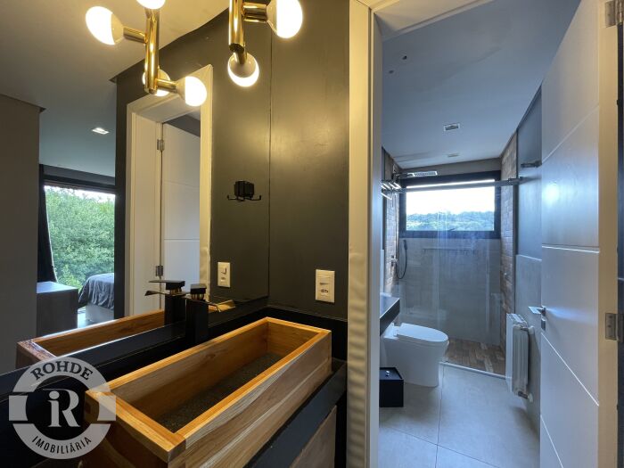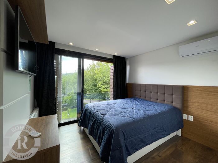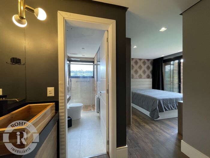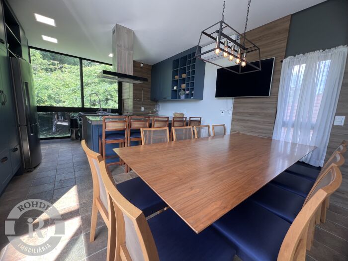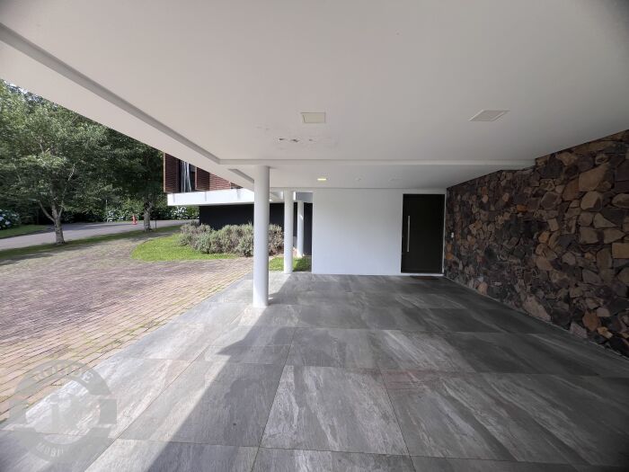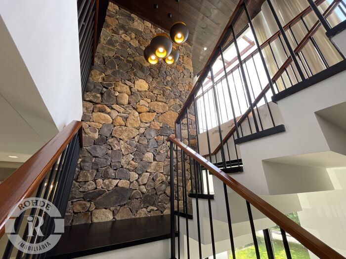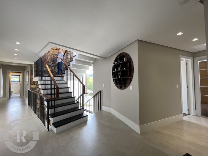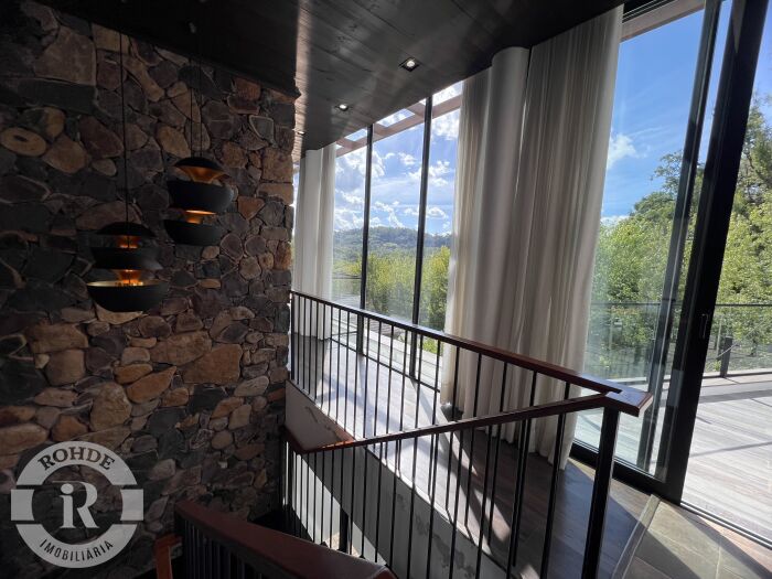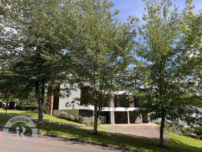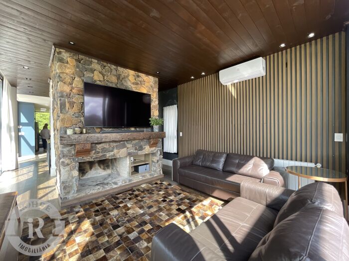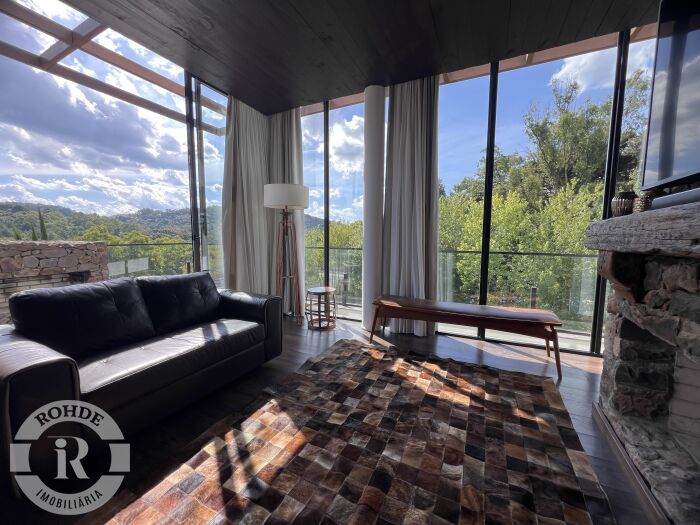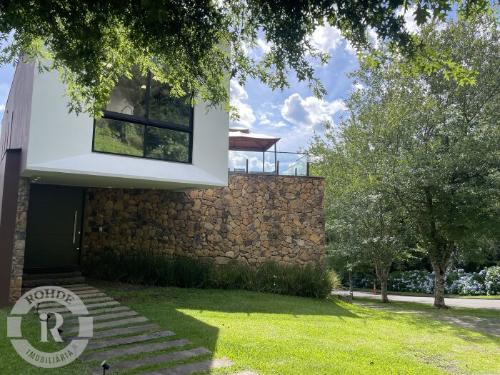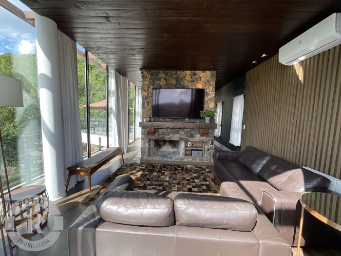 Casa mobiliada de esquina no Alphaville em Gramado. Com 4 suítes térreas, área social no segundo piso, lavabo, sala de estar com lareira interna, sacada com lareira externa a gás com linda vista, cozinha com bancada gourmet em pedra basalto com churrasqueira, sala de jantar e sala de jantar externa, amplas aberturas em alumínio com vidros duplos. No subsolo, lavanderia, banheiro, 3 vagas de garagem, carregador para carro elétrico. Splits e calefação instalados.
